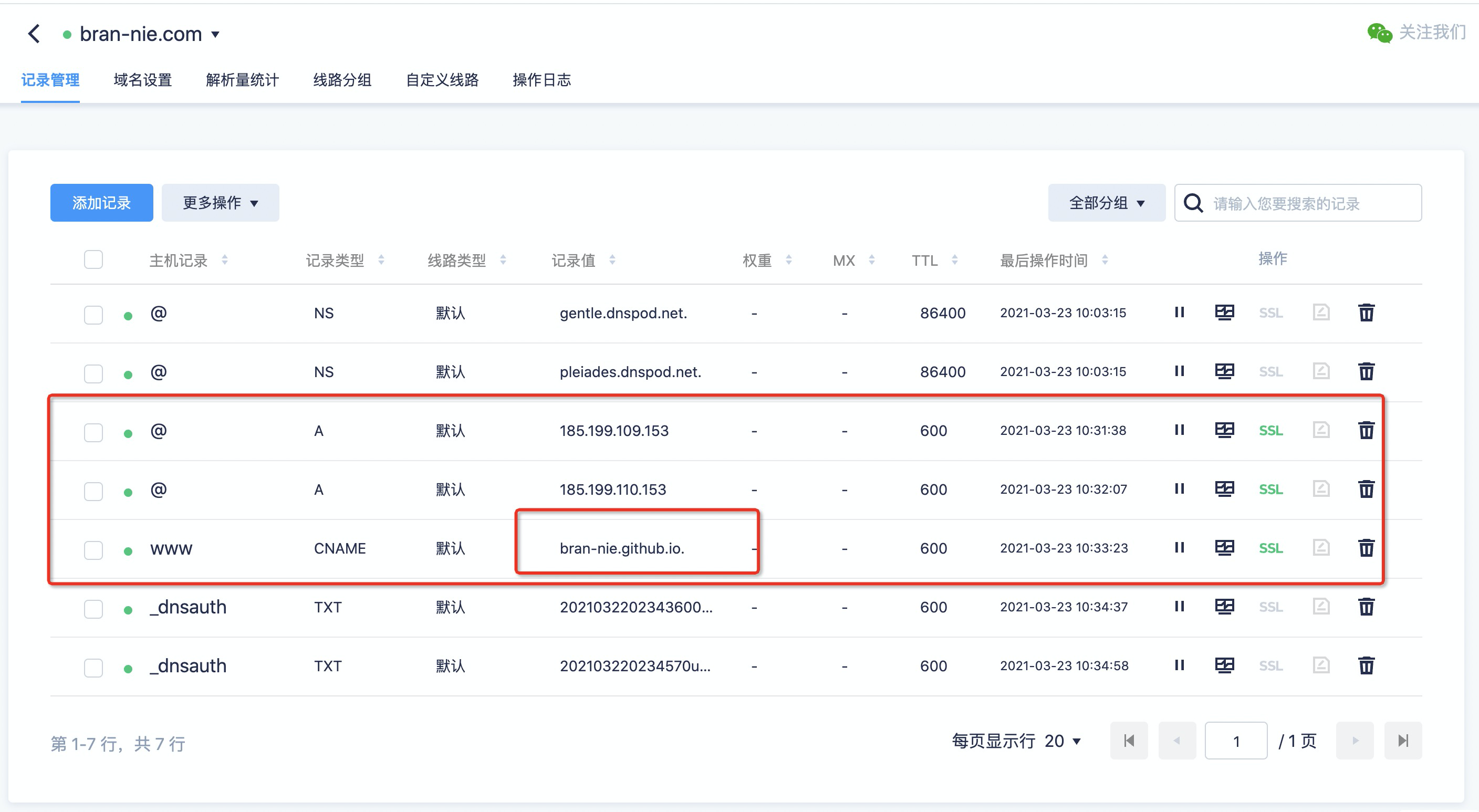 2. 添加记录,两条 A 记录和一个 CNAME 记录即可。可以仿照图片添加,需要替换的是 CNAME 那里的记录值,换成你的 GitHub page 地址。