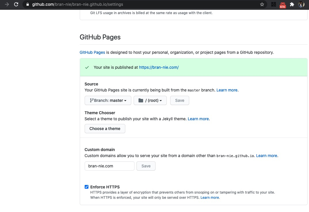 3. 随后,你在项目仓库的 Setting 中,就能看到类似我的这样的信息。如果自定义域名还没有添加证书,则这里的 HTTPS 是不能勾选的 说明已经 OK 了
