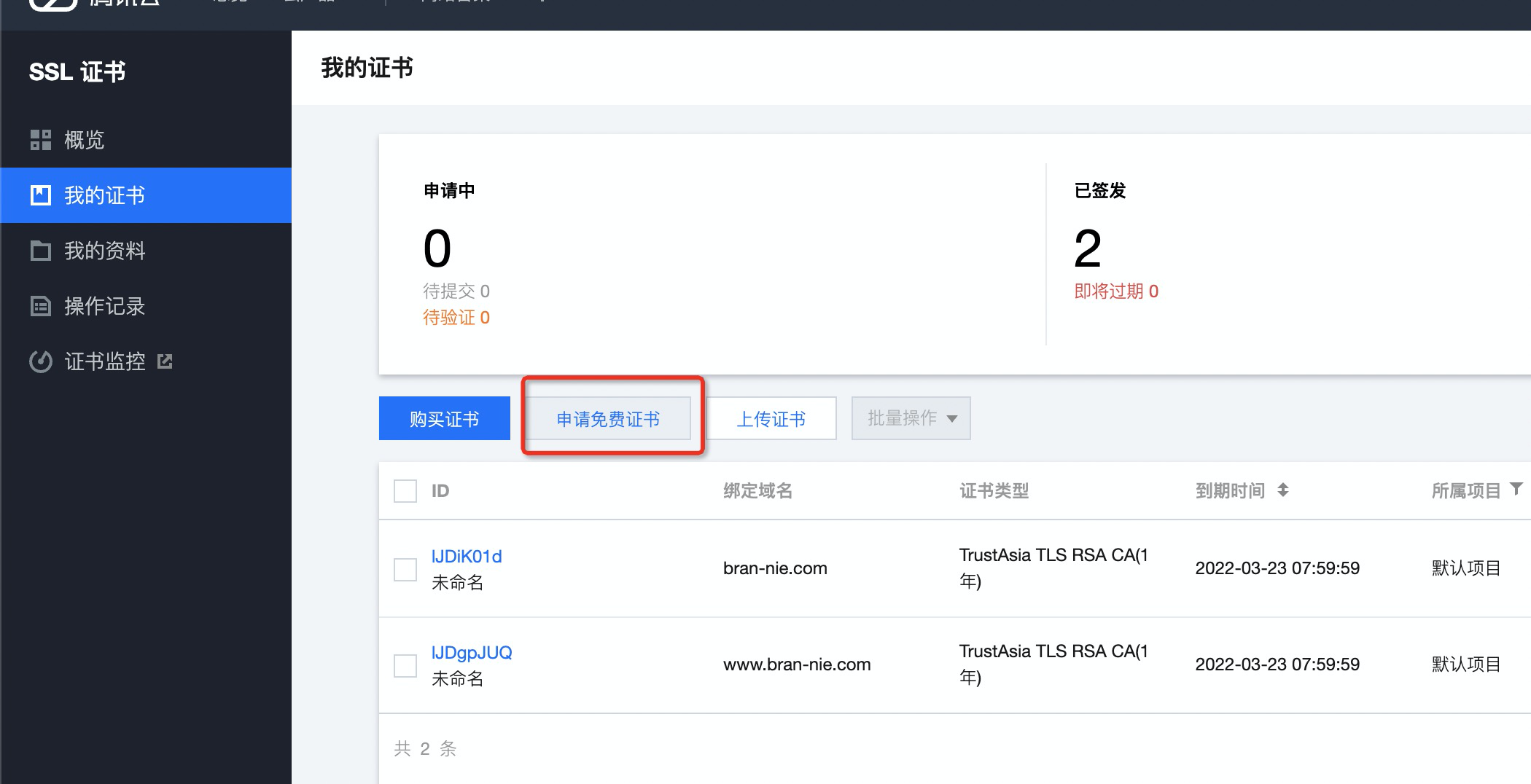 再或者,可以在域名控制台,找到证书相关的菜单,申请证书即可。如图: