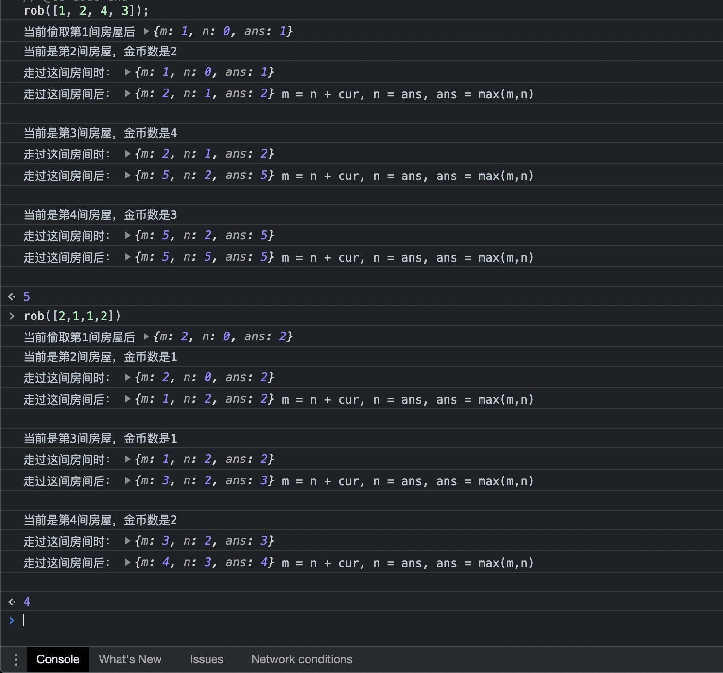 console.log(`走过这间房间后:`, { m, n, ans }, 'm = n + cur, n = ans, ans = max(m,n)');